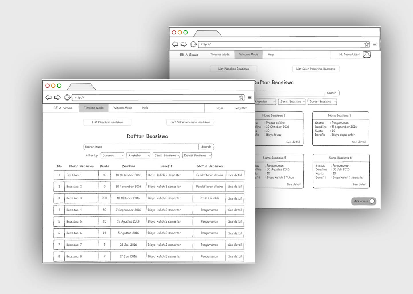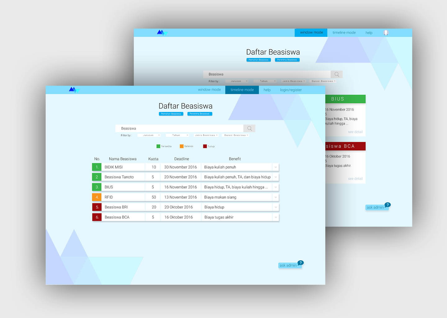 Be A Siswa is a mockup of a web application. This website is designed to provide information about scholarships for students who need it. Each scholarship on this website is displayed with a specific color (red, yellow, and green), which aims to mark the status of a scholarship within available, expires, or is in a period of selection. It is intended that users can more easily identify and distinguish each any scholarships displayed.