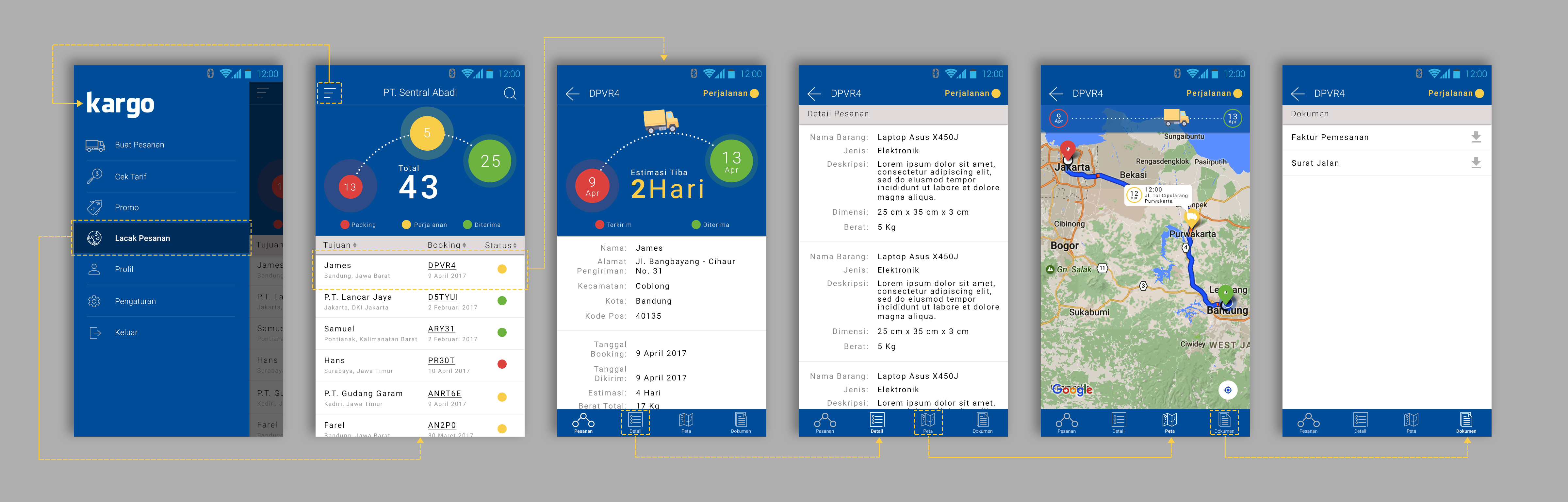 The first conception and stylistic decision for the design presented with the same color scheme with Kargo website. I developed and designed 6 screens of different fungsionality: