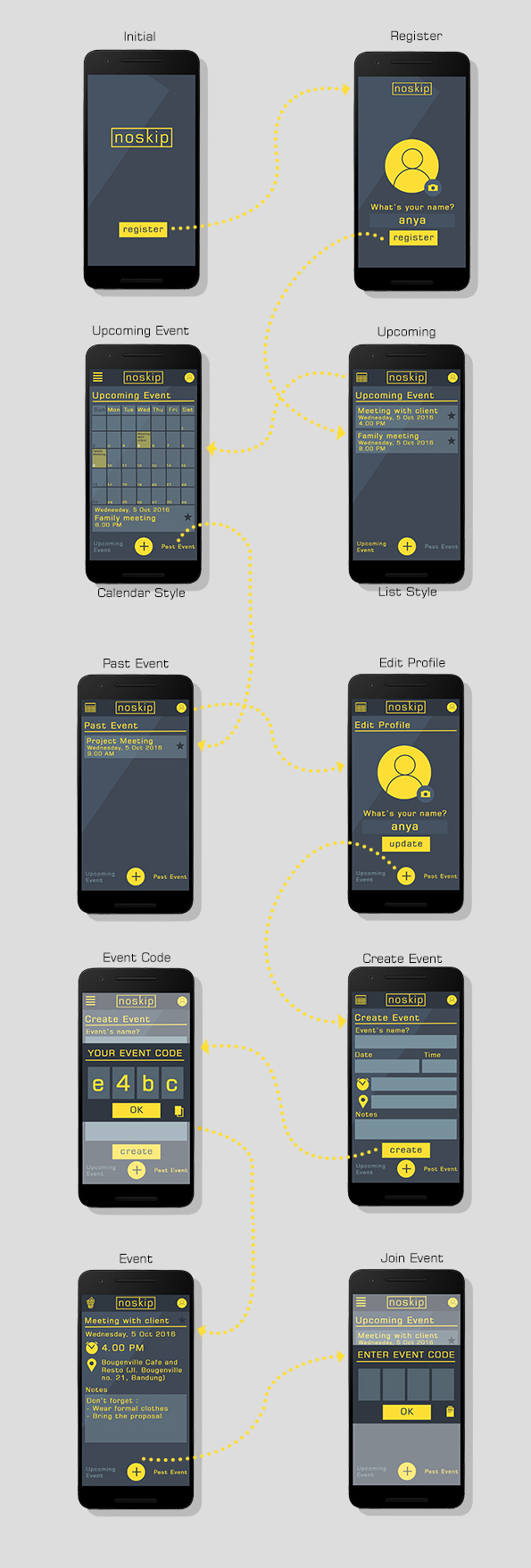Noskip is a concept of an idea about integrated agenda. The idea comes from our disquiet about the number of people who often forget their appointments. This is often because they are too lazy to write an agenda on their calendars. Based on that story, we design an integrated application that is capable of adding an agenda with ease.