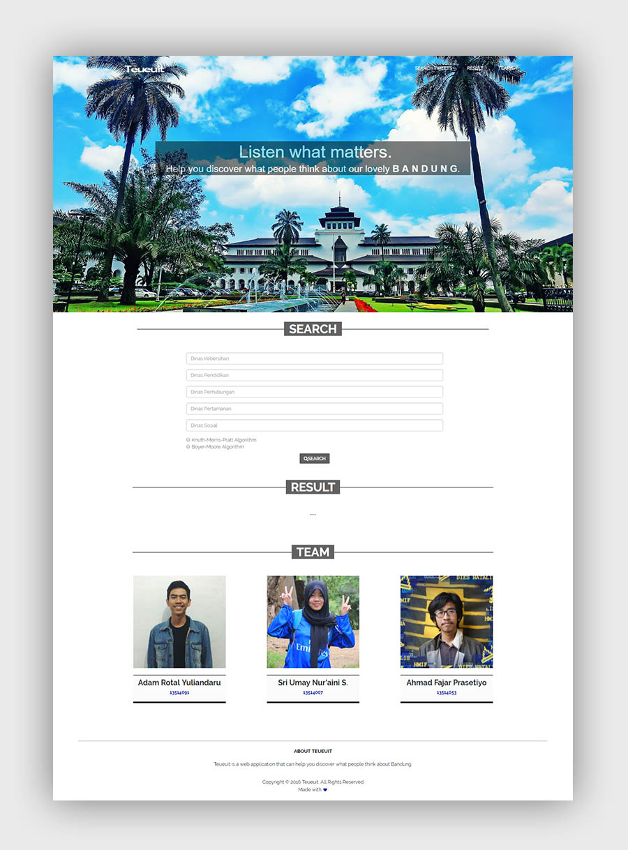 Teueuit is an web application that fetch tweets of Twitter's users in Bandung and dispose each tweets based on entered keyword. Teueuit will ask you to enter keywords regarding on each Department (Dinas) of Government of Kota Bandung. Teueuit was built on Visual Studio using ASP.NET and Bootstrap for the front-end and C# for the back-end using Twitter API.