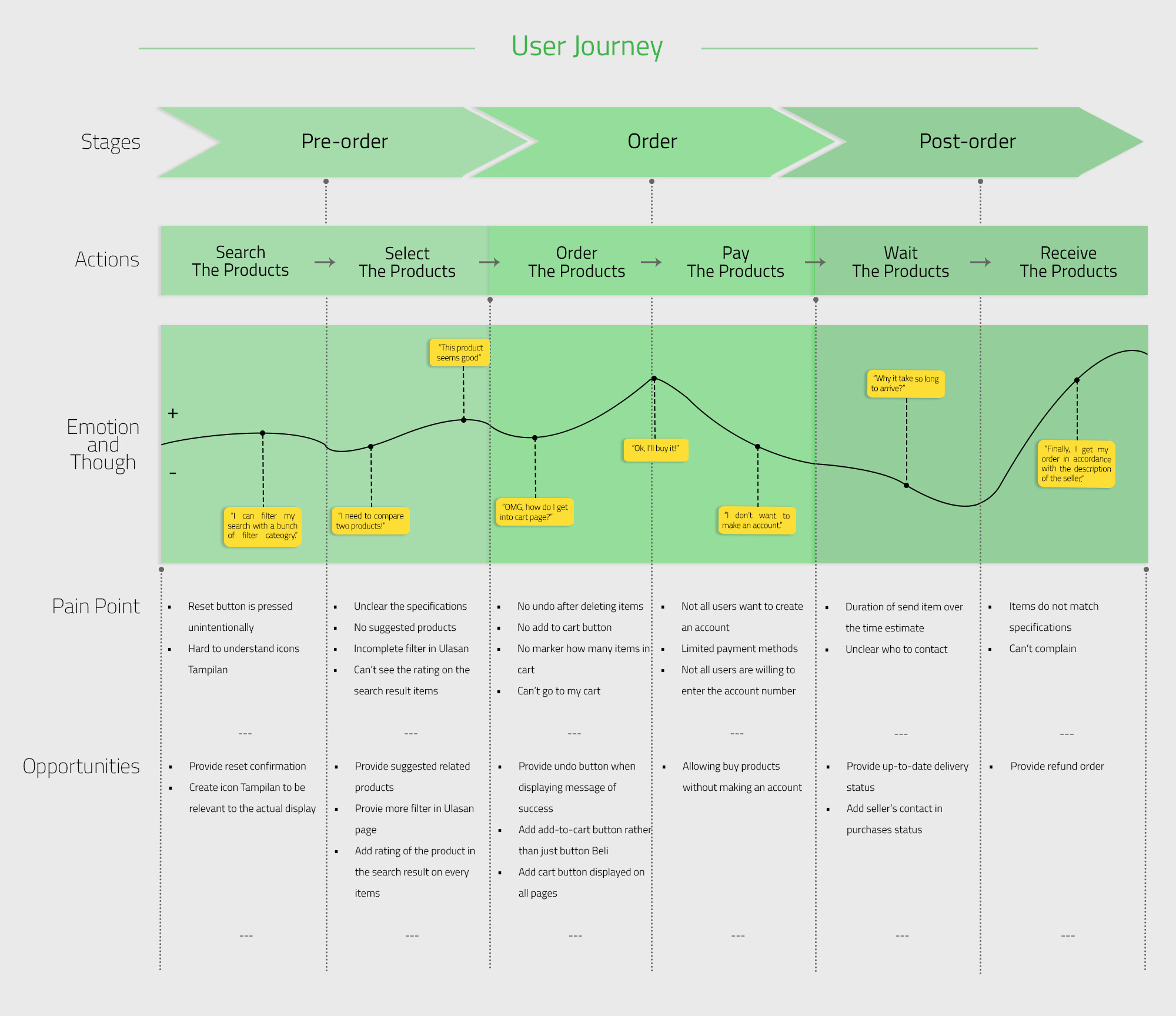 From the results of research and product definition, managed to created the user journey which includes the pain point for any actions or stages in the use of the existing app. In addition it also offered opportunities to improve existing pain points.
